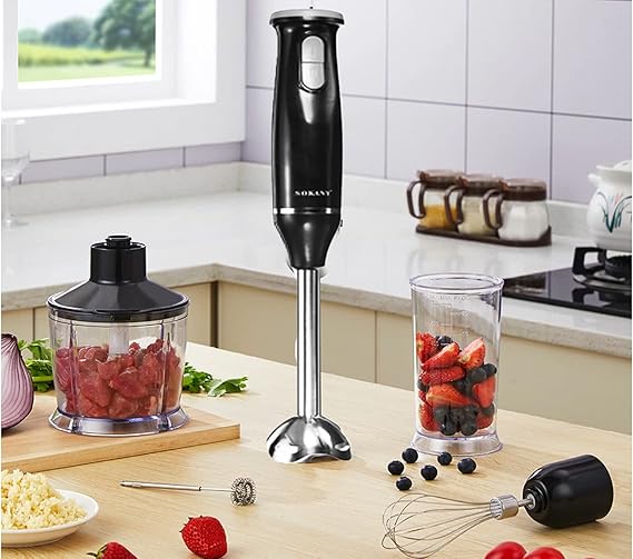 يأتي Sokany Hand Blender 5 في 1 بجسم متين من البلاستيك الآمن للاستخدام مع الطعام، بلون أسود أنيق ينسجم مع ديكور أي مطبخ. الساق المعدنية المصنوعة من الستانلس بطول 20.5 سم تمنح أداء ثابتاً وسرعة متوازنة أثناء الخلط. المحرك يعمل بقوة 800 واط على جهد 220-240 فولت، مما يجعله مثالياً للاستعمال اليومي في المنازل.